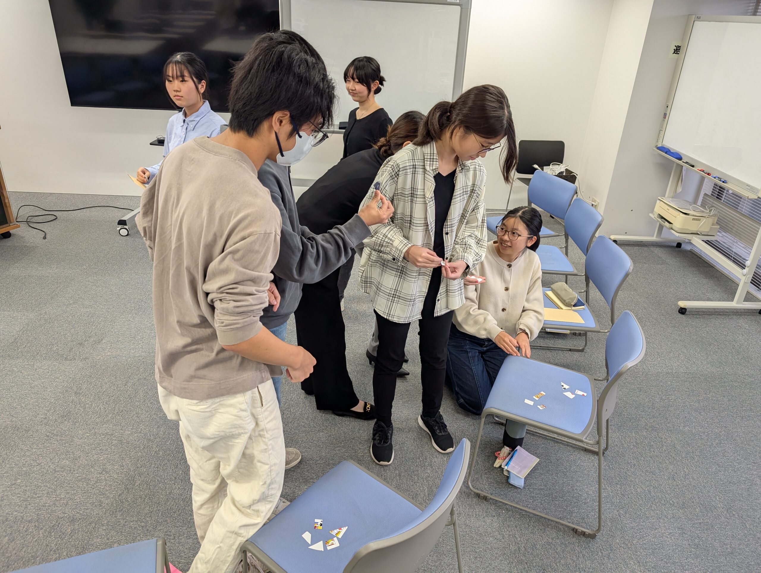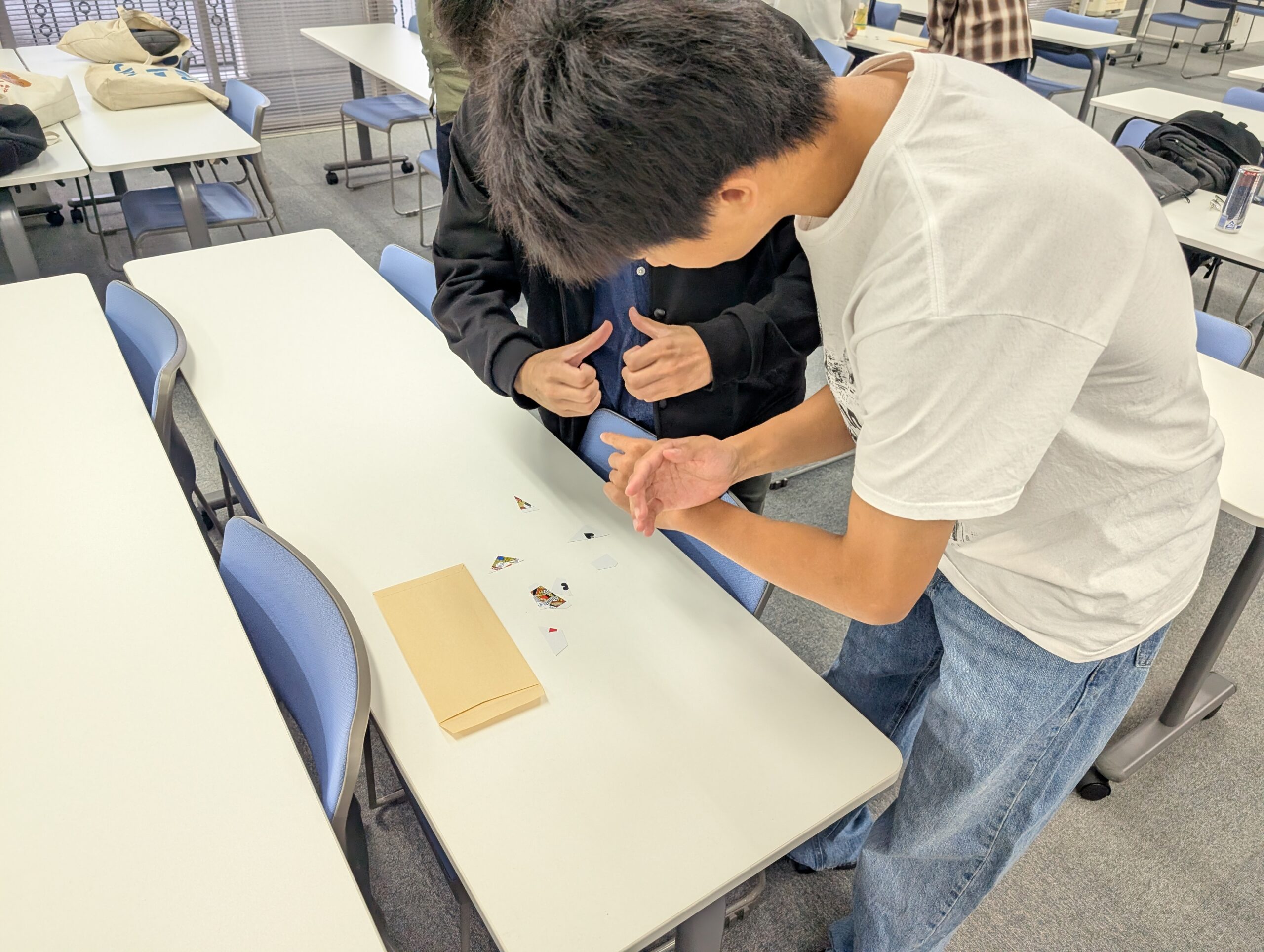 講座の終盤には、Riggingゲーム(談合ゲーム)を実施。言葉を使わずジェスチャーのみで交渉を行い、カードのパーツを集めて完成させるゲームを通じて、ルールにとらわれすぎず柔軟に考えることや、状況把握の重要性について体験的に学びました。