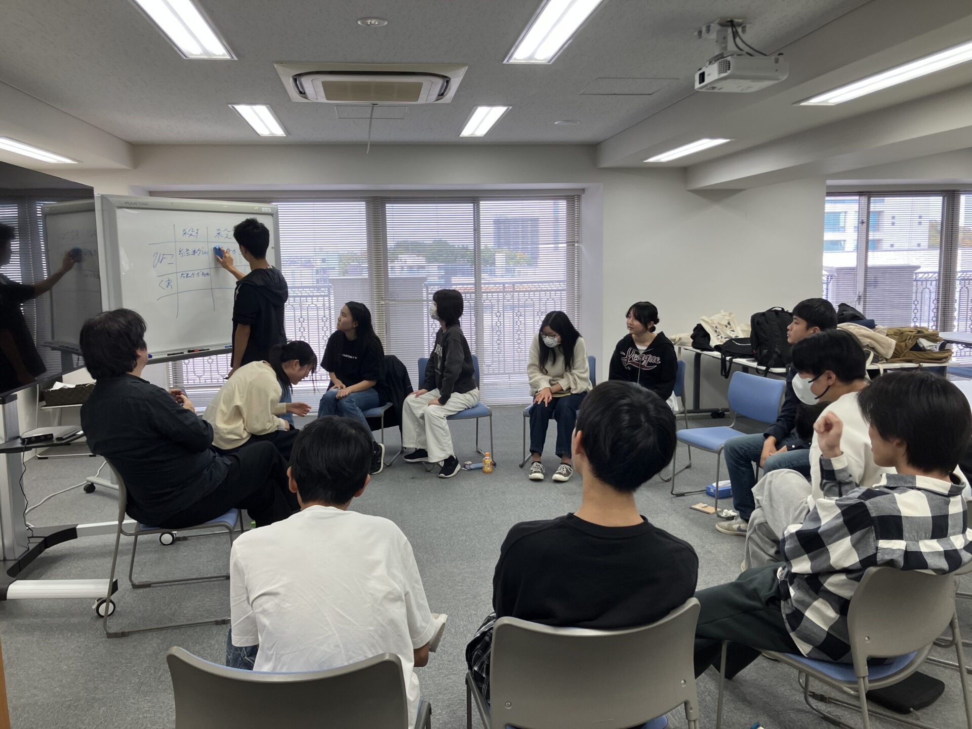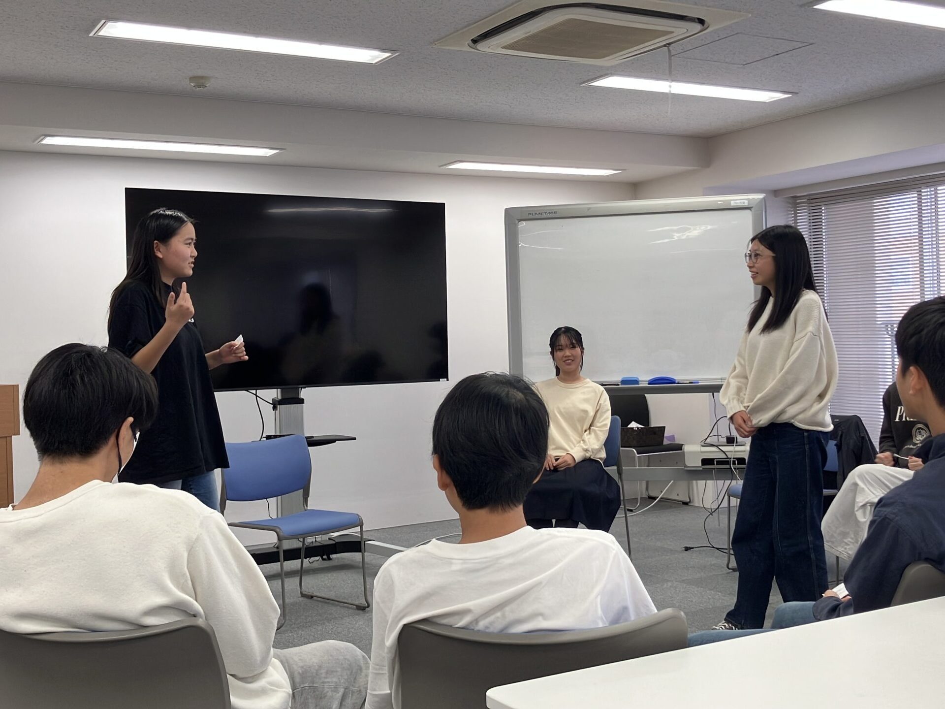最後に、座標ゲームやインプロヴィゼーションのワークを通じて、即興的な思考力やコミュニケーション能力を養いました。特にインプロヴィゼーションでは、与えられた最初の文章から会話を発展させていくワークを実施し、ストーリーを作るための言葉の使い方について学びました。